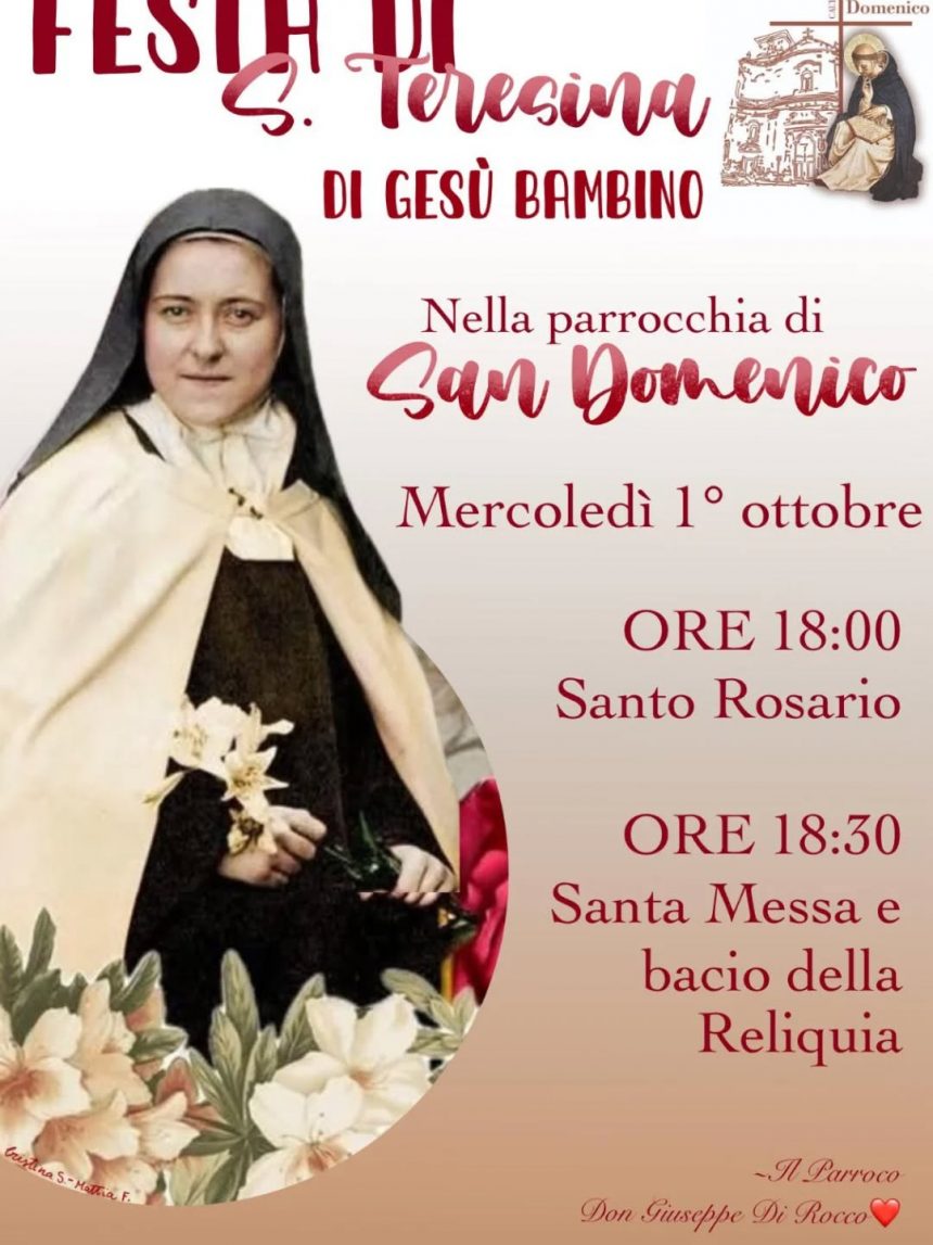 Chiesa1° Ottobre: festa di S. Teresina di Gesù Bambino alla parrocchia San Domenico Ultimo aggiornamento: Settembre 28, 2025 2:22 pm redazione 220 Views Condividere CONDIVIDERE TAGGED:padre Giuseppe Di Rocco Condividi Questo Articolo Facebook Twitter Whatsapp Whatsapp Copy Link Print