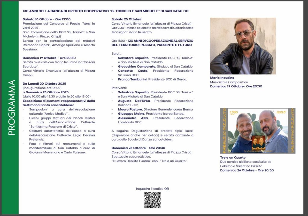Sono iniziati i festeggiamenti per i 130 anni dalla fondazione della Banca di Credito Cooperativo “G. Toniolo e San Michele” di San Cataldo, che prevedono una settimana di eventi culturali e incontri, con la premiazione del concorso “Versi inversi 2025”,organizzato dalla Pro Loco, grazie al presidente Salvatore Scarlata e alle volontarie Giulia Amoribello e Gaia Gattuso.
