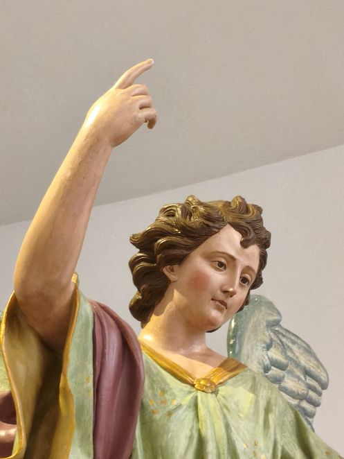 E poi c’è l’angelo. Basta fermarsi lì per capire il salto. I ricci mossi dal vento, le gote arrossate, quel sapore inconfondibilmente napoletano che sembra uscire direttamente da una bottega di San Gregorio Armeno. Il mantello scivola su un muretto e suggerisce il volo, mentre i piedi restano sospesi, come se l’angelo non avesse mai toccato terra.