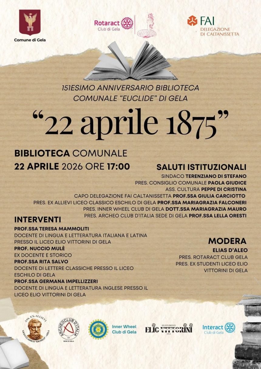 Il FAI, il Comune di Gela e il Rotaract, insieme ai club service cittadini, ricordano la fondazione della Biblioteca Comunale di Gela, il 22 aprile 1875, con un incontro culturale mercoledì 22 aprile 2026 presso la Biblioteca, con inizio alle ore 17.