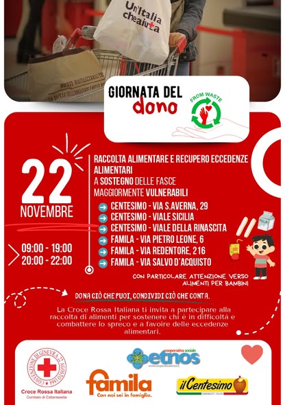 La Croce Rossa si appella alla sensibilità dei cittadini nisseni e chiede per Sabato  22 Novembre 2025 dalle ore 9.00 fino alle ore 21.00 la massima solidarietà possibile per poter riempire i carrelli di generi alimentari e prodotti per l’igiene presso i vari punti vendita della città che hanno aderito all’iniziativa ”Giornata del Dono – From Waste to Aid ”.
