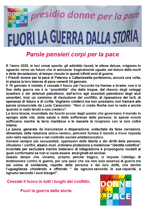Cronaca Attualità24 gennaio: di nuovo in piazza le Donne per la Pace anche a Caltanissetta Ultimo aggiornamento: Gennaio 20, 2025 1:16 pm redazione 180 Views Condividere 0 Min Leggere CONDIVIDERE TAGGED:Presidio delle Donne per la Pace Condividi Questo Articolo Facebook Twitter Whatsapp Whatsapp Copy Link Print