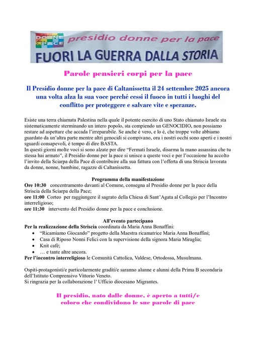 Cronaca Attualità24 settembre ore 10,30: consegna della Sciarpa della Pace e incontro interreligioso Ultimo aggiornamento: Settembre 23, 2025 10:45 am redazione 121 Views Condividere CONDIVIDERE TAGGED:maria Anna BonaffiniMaria Miragliaonde donneinmovimento Condividi Questo Articolo Facebook Twitter Whatsapp Whatsapp Copy Link Print