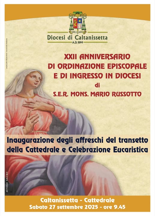 Sabato 27 settembre alle 9,45, nella cattedrale di Caltanissetta saranno “svelati” gli affreschi dei due transetti, opera del M° Salvatore Seme, che il Vescovo mons. Mario Russotto ha voluto a coronamento dell’anno del 180° anniversario di fondazione della Diocesi.