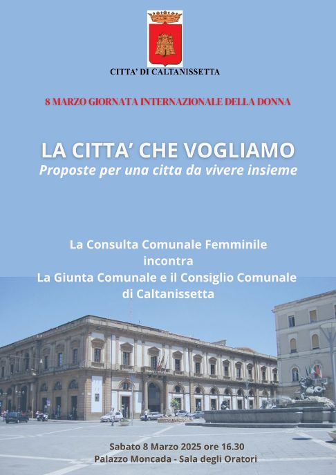 Un 8 marzo finalmente diverso dal solito, quest’anno a Caltanissetta, dove la Consulta Femminile Comunale ha chiesto un incontro con il Consiglio comunale la Giunta, per un confronto a 360° sull’idea di città, la sua urbanistica, i suoi servizi, i suoi sistemi di relazioni, in cui tutte e tutti possano riconoscersi: “Una città a misura (anche) di donna.”