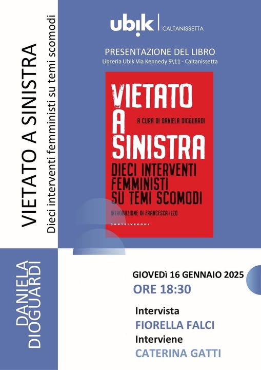 “Vietato a sinistra” è infatti il titolo del volume, che sarà presentato con una intervista a Daniela Dioguardi condotta da Fiorella Falci e con un intervento di Caterina Gatti, una delle autrici dei saggi pubblicati.