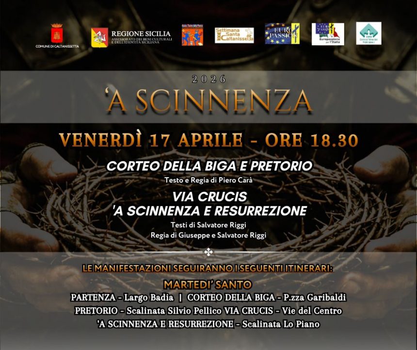Eventi‘A Scinnenza il 17 aprile a Caltanissetta recupera la sacra rappresentazione rinviata per il maltempo Ultimo aggiornamento: Aprile 14, 2026 1:59 pm redazione 154 Views Condividere CONDIVIDERE TAGGED:Giuseppe RiggiPiero CaràSalvatore Riggi Condividi Questo Articolo Facebook Twitter Whatsapp Whatsapp Copy Link Print