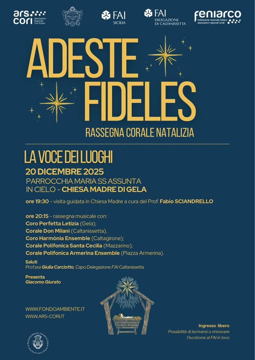 “Adeste fideles – La voce dei luoghi” è il titolo della rassegna corale natalizia promossa dal FAI (Fondo Ambiente Italiano) che si svolgerà a Gela in chiesa madre, sabato 20 dicembre dalle 19,30, con ingresso libero.