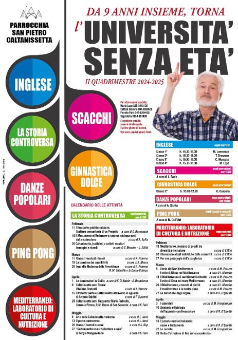 Martedì 6 maggio e martedì 13 maggio 2025, alle ore 17:30, saranno proposte due lezioni dall’Università senza età di Caltanissetta, presso l’auditorium “Monsignor Cataldo Naro” della parrocchia San Pietro.