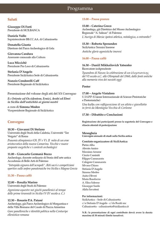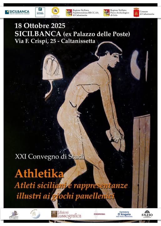 Giornata di studi promossa da SiciliAntica a Caltanissetta sabato 18 ottobre dalle 9,30 presso Sicilbanca (via Crispi, 25): studiosi, docenti universitari e archeologi approfondiranno il tema “Athletika. Atleti siciliani e rappresentanze illustri ai giochi panellenici” legato allo sport nell’antichità ellenica e la sua influenza nella Sicilia greca, come elemento fondativo anche di identità politiche delle comunità, di proiezioni mitologiche e fonte di ispirazione per molte opere d’arte.