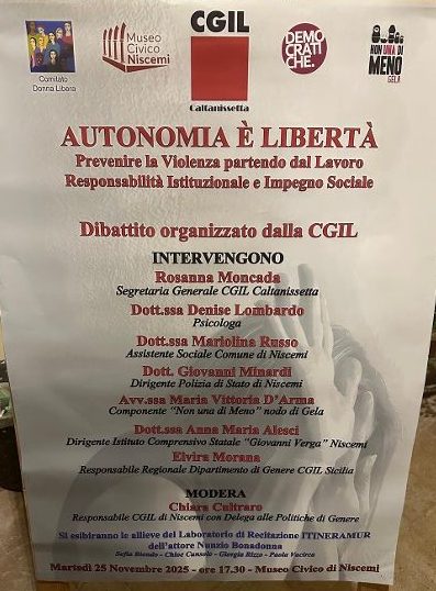 Autonomia e’ Liberta’ , Prevenire  la violenza partendo dal lavoro, responsabilità istituzionale e impegno sociale  è il titolo dell’iniziativa promossa il 25 novembre dalla Cgil di Caltanissetta al museo civico di Niscemi