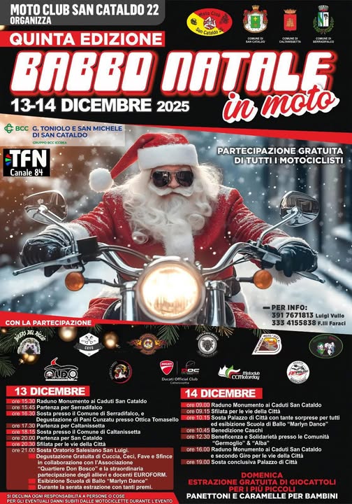 “Portiamo per le strade della città non solo rumore di motori, ma soprattutto solidarietà, entusiasmo e spirito di comunità – ha scritto il presidente del Moto Club San Cataldo 22, Luigi Vullo – Ogni partecipante contribuirà, con la propria presenza, a sostenere le iniziative di beneficenza che il nostro club porta avanti con impegno e trasparenza. Sarà un momento di festa, sorrisi e condivisione, pensato per regalare gioia ai bambini e per ricordare a tutti che la magia del Natale nasce dai gesti semplici e dall’amore per gli altri. Il nostro obiettivo, come sempre, è unire passione e solidarietà. Ogni evento, ogni iniziativa, è un modo per restituire qualcosa alla nostra comunità e aiutare chi ne ha più bisogno. Ringrazio tutti i volontari, i soci del Moto Club, l’amministrazione comunale e ogni persona che, con il proprio contributo, rende possibile questa bellissima manifestazione. Vi aspettiamo numerosi, con il cuore aperto e lo spirito natalizio acceso. Insieme, anche quest’anno, dimostreremo che la beneficenza corre veloce… soprattutto su due ruote”.