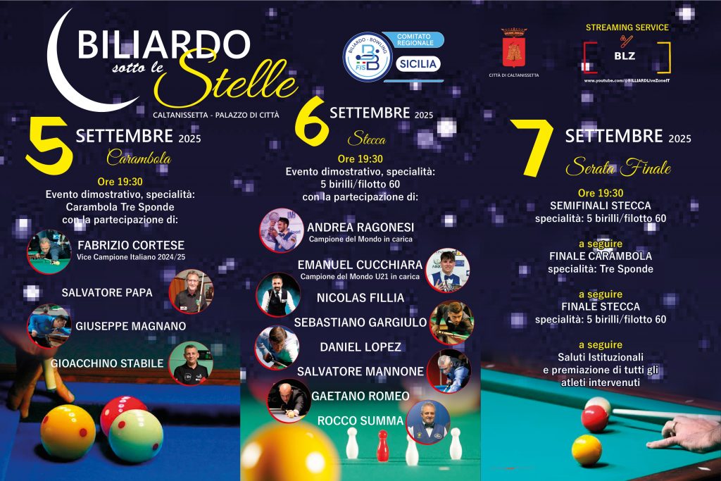 “Biliardo sotto le stelle”, organizzato dalla Federazione Italiana Sport Biliardo e Bowling (F.I.S.B.B. SICILIA), è un evento open che per tre serate consecutive accoglierà molti esponenti di spicco della disciplina della carambola a tre sponde e della stecca a 5 e 9 birilli.