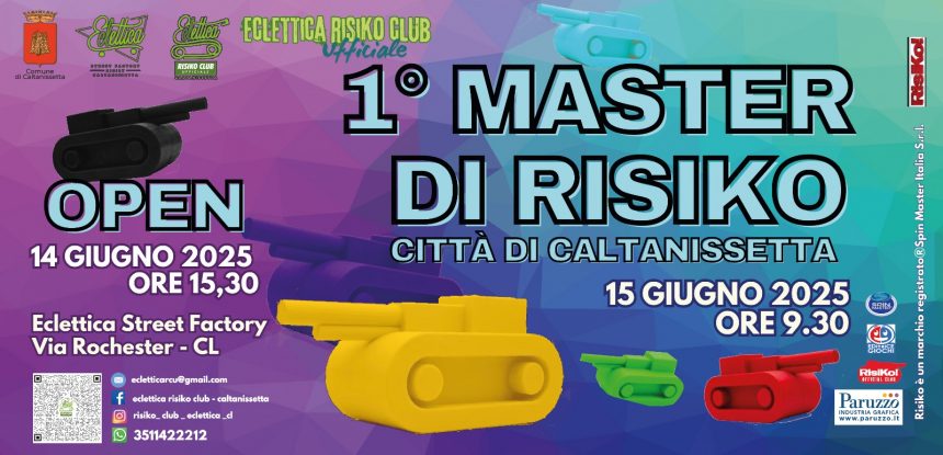 Domenica 15 giugno, presso Eclettica Street Factory (via Rochester), si terrà il I° Master “Città di Caltanissetta” organizzato dal RCU nisseno con il patrocinio del Comune di Caltanissetta. L’evento di caratura nazionale, assegnato al Risiko Club di Caltanissetta dai referenti nazionali di EG, è valido per il Ranking nazionale e da diritto al vincitore di partecipare al Campionato Nazionale Individuale 2026.