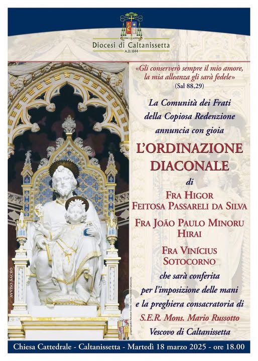 Tre giovani Frati della Copiosa Redenzione saranno ordinati Diaconi dal Vescovo Mons. Mario Russotto, nel corso di una solenne celebrazione in Cattedrale il 18 marzo alle ore 18.