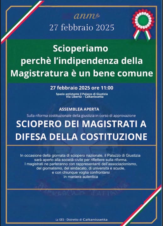 L’indipendenza della magistratura è un bene comune da tutelare, la riforma proposta dal Governo minaccia di compromettere l’imparzialità e l’indipendenza della magistratura, creando un sistema giudiziario meno equilibrato, più vulnerabile alle interferenze esterne, meno attento alle garanzie per i cittadini. I magistrati, anche a Caltanissetta, in occasione dell’inaugurazione dell’anno giudiziario, avevano già manifestato il loro dissenso con una copia della Costituzione in mano a ciascuno di loro durante l’intervento del rappresentante del Governo.
