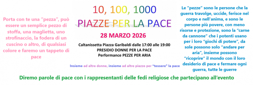 Il Presidio donne per la pace di Caltanissetta che aderisce alla “Rete nazionale 10, 100, 1000 piazze  di donne per la pace”, in occasione della manifestazione indetta per sabato 28 marzo 2026, insieme ad altre donne, insieme ad altre Piazze, sarà in Piazza Garibaldi per testimoniare la volontà di pace e l’opposizione ad un sistema di potere, di cui sono artefici anche donne di governo, che vuole convincerci della necessità della guerra.