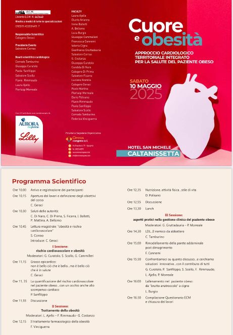L’evento E.C.M., rivolto a medici, infermieri, biologi e nutrizionisti, prevede l’assegnazione di 7 crediti formativi e sarà diviso in tre sessioni: la prima dedicata al rischio cardiovascolare e l’obesità, a cura dei cardiologi Calogero Geraci e Paola Sanfilippo; la seconda dedicata al trattamento dell’obesità con relatori Federica Vinciguerra e Dario Polisano; la terza sugli aspetti pratici nella gestione clinica del paziente obeso a cura di Corrado Tamburino, Francesca Cannemi, Giuseppa Curatolo, Paola Sanfilippo, Salvatore Scollo, Flavio Rimmaudo, Laura Ajello, Pierluigi Morreale, Valeria Cigna e Luca Burgio.