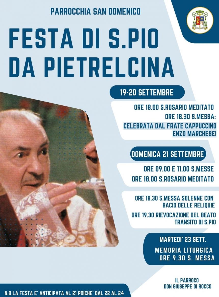 Quest’anno, la festa di San Pio viene anticipata di qualche giorno, poichè il 23 settembre si svolgerà la “Tre Tende” diocesana nella chiesa di S. Luca con S.E. il Vescovo.
