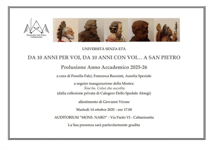 Si inaugura il nuovo anno accademico dell’Università senza età, istituita dieci anni fa dalla parrocchia S. Pietro di Caltanissetta, da una felice intuizione dell’indimenticabile prof. Sergio Mangiavillano, sostenuta con entusiasmo dal parroco Don Rino Dello Spedale Alongi, anima del progetto che tutt’oggi coordina insieme ad un Comitato scientifico di docenti delle diverse discipline.