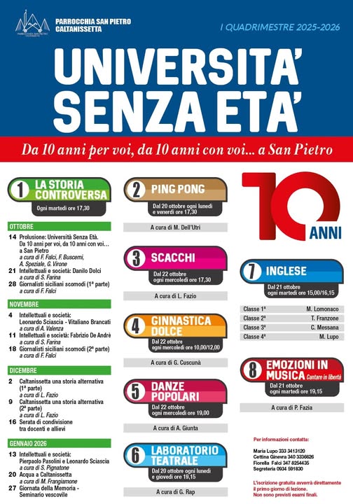 Si inaugura il nuovo anno accademico dell’Università senza età, istituita dieci anni fa dalla parrocchia S. Pietro di Caltanissetta, da una felice intuizione dell’indimenticabile prof. Sergio Mangiavillano, sostenuta con entusiasmo dal parroco Don Rino Dello Spedale Alongi, anima del progetto che tutt’oggi coordina insieme ad un Comitato scientifico di docenti delle diverse discipline.