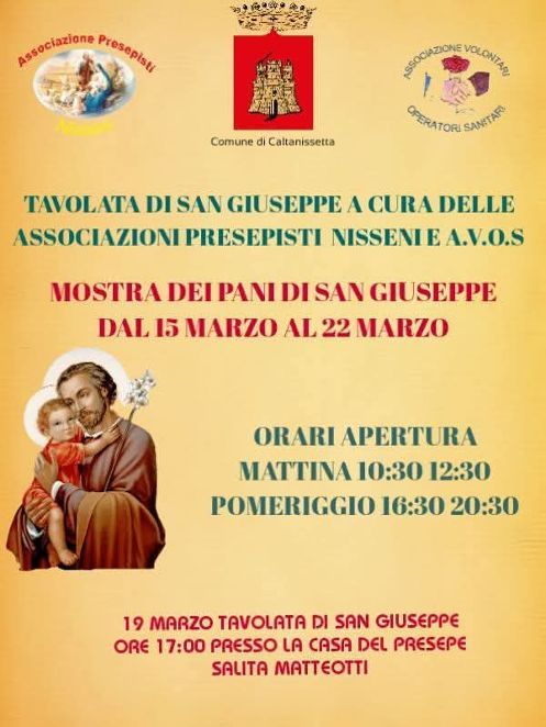 Sabato 15 Marzo alle ore 11 l’Associazione Presepisti Nisseni in collaborazione con l’Associazione A.V.O.S. presso la Casa del Presepe in Salita Matteotti apriranno al pubblico la splendida esposizione dei pani di San Giuseppe, pani provenienti da tutti i paesi limitrofi con forme svariate che daranno vita ad una spettacolare esposizione.