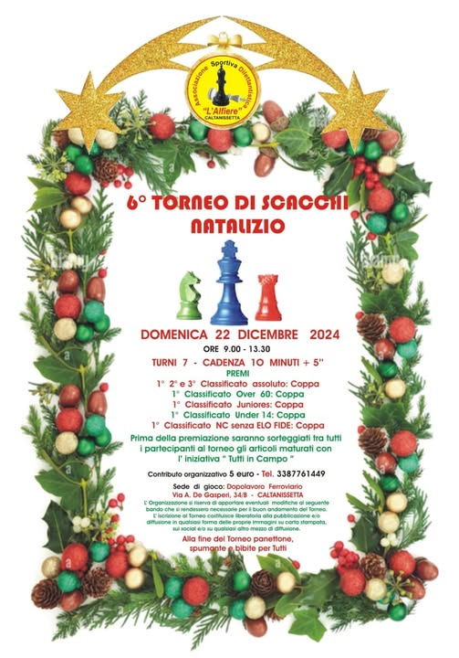 Il Circolo degli Scacchi “L’Alfiere” di Caltanissetta festeggia il Natale domenica 22 dicembre con il 6° Torneo Natalizio, dalle 9 alle 13,30 nella propria sede storica del Dopolavoro Ferroviario, in via A. De Gasperi, 34/B.