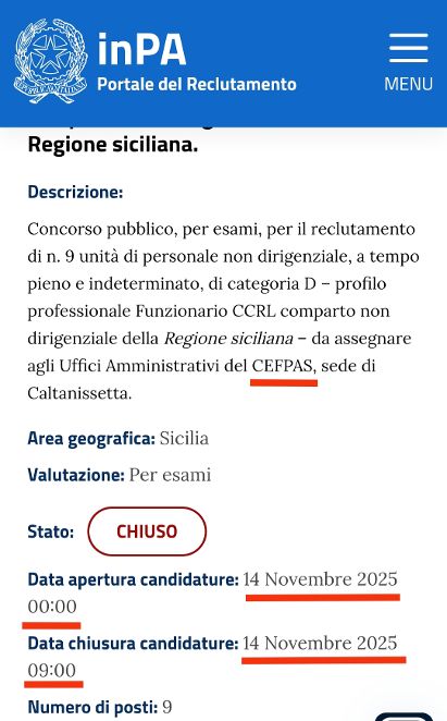 Ho appreso che nella giornata del 14 novembre 2025, il CEFPAS di Caltanissetta ha aperto le candidature per un concorso pubblico, per esami, per l’assunzione, a tempo pieno e indeterminato, di n. 9 unità di personale di categoria D, profilo professionale Funzionario. CCRL comparto non dirigenziale della Regione siciliana.