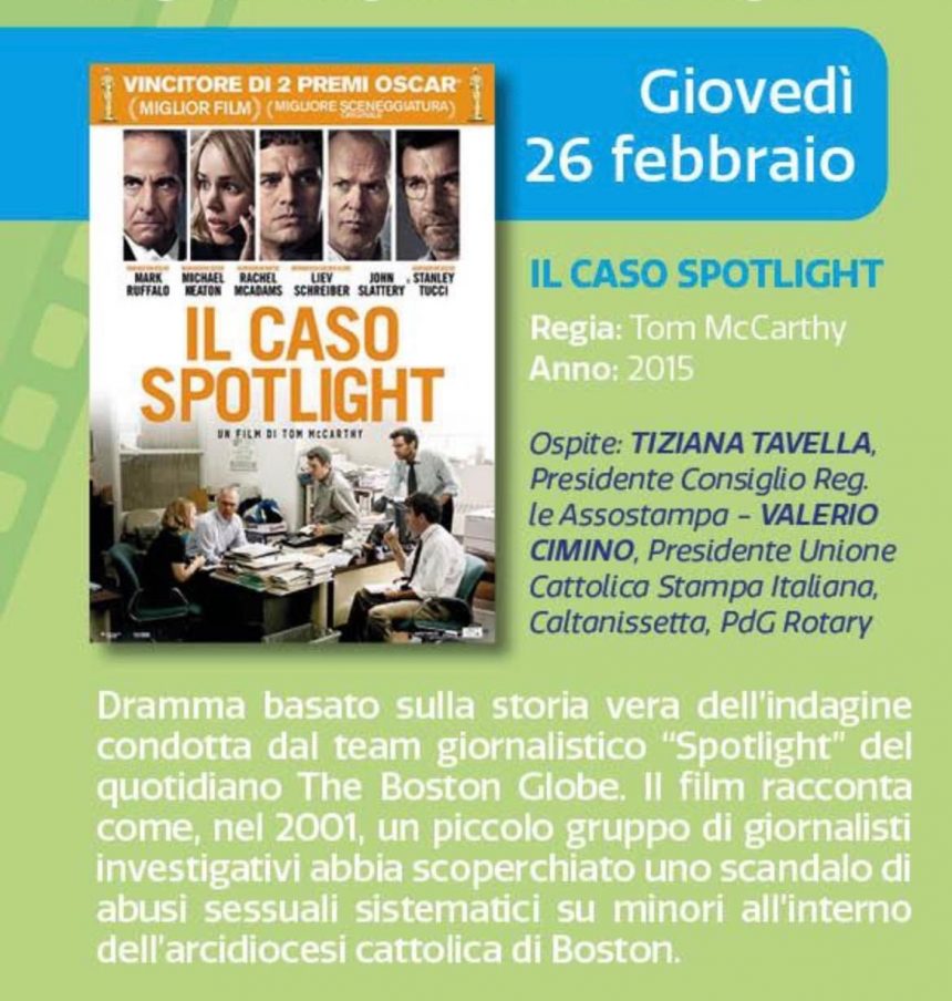 Per il Cineforum del Rotary Club di Caltanissetta “AlteriAmoCi per Bene“, in programma giovedì 26 febbraio alle 19,30 alla Multisala Palazzo Moncada, “Il caso Spotligh”, due Oscar nel 2016, un film sulla storia vera di un’inchiesta giornalistica che portò ad una serie di arresti per pedofilia nella diocesi di Boston.