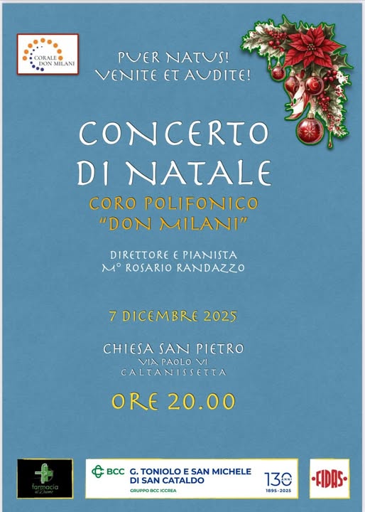 “Puer natus” Venite et audite!” un invito all’ascolto nel cuore del tempo di Avvento viene dalla parrocchia San Pietro di Caltanissetta, retta da Don Rino Dello Spedale Alongi, che organizza, per domenica 7 dicembre alle ore 20, un Concerto natalizio con il Coro “Don Milani”, il più antico e prestigioso della città, diretto dal M° Rosario Randazzo.