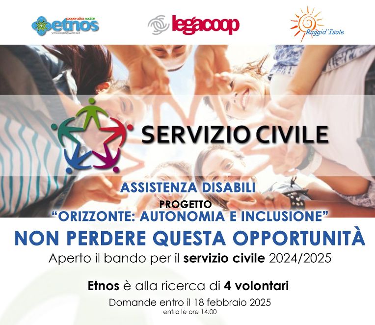 Nel 2025 la cooperativa sociale Etnos di Caltanissetta accoglierà all’interno della struttura “Raggi d’Isole” 4 volontari del Servizio civile universale. La presidenza del Consiglio ha infatti accolto il progetto di assistenza ai disabili “Orizzonte: autonomia e inclusione”.