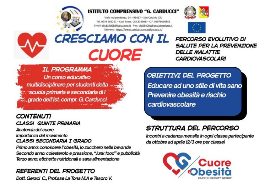 L’Istituto Comprensivo “G. Carducci” di San Cataldo ha approvato e avviato il progetto “Cuore e obesità”, che si svolgerà durante l’intero anno scolastico 2025/2026. Il progetto prevede un percorso educativo che si articola in lezioni interattive e laboratori a carattere pratico e intende educare gli alunni e le alunne, sin dalla scuola primaria, ad acquisire uno stile di vita sano, prevenire l’obesità e il rischio di malattie cardiovascolari in età scolare.