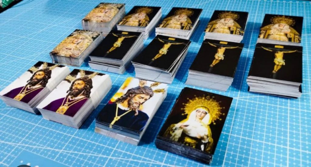 Si narra che, molti anni fa a Siviglia, durante una processione di una confraternita, una donna molto povera desiderasse avere un ricordo dell’immagine sacra che passava. Non potendo acquistare medaglie o altri oggetti religiosi, si mise a piangere davanti al simulacro dell’Addolorata. Un confratello della Confraternita della Macarena, l’Addolorata dei Sivigliani oggetto di grande culto e devozione, vedendola così commossa, le donò una piccola immagine stampata della Madonna che custodiva per devozione. La donna la strinse tra le mani come un tesoro. Da quel momento, racconta la tradizione, i confratelli iniziarono a stampare piccole immagini dei loro simulacri per distribuirle gratuitamente ai fedeli durante le processioni.