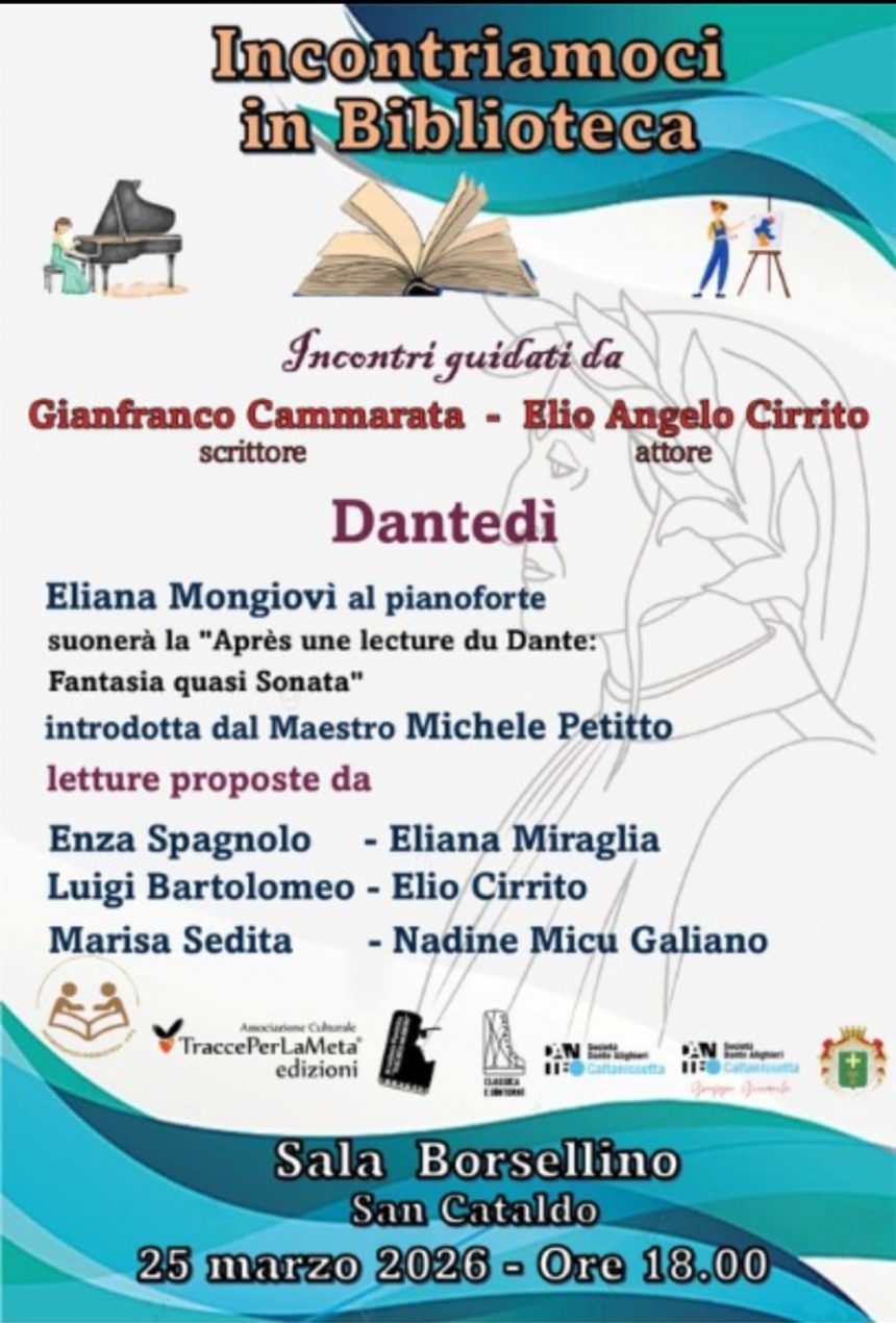 Cultura ed EventiDantedì a S. Cataldo il 25 marzo alle 18, Sala Borsellino Ultimo aggiornamento: Marzo 24, 2026 11:08 pm redazione 42 Views Condividere CONDIVIDERE TAGGED:Eliana MiragliaEliana MongiovìElio CirritoEnza SpagnoloGianfranco CammarataLuigi BartolomeoM° Michele PetittoMarisa SeditaNadine Micu Galiano Condividi Questo Articolo Facebook Twitter Whatsapp Whatsapp Copy Link Print
