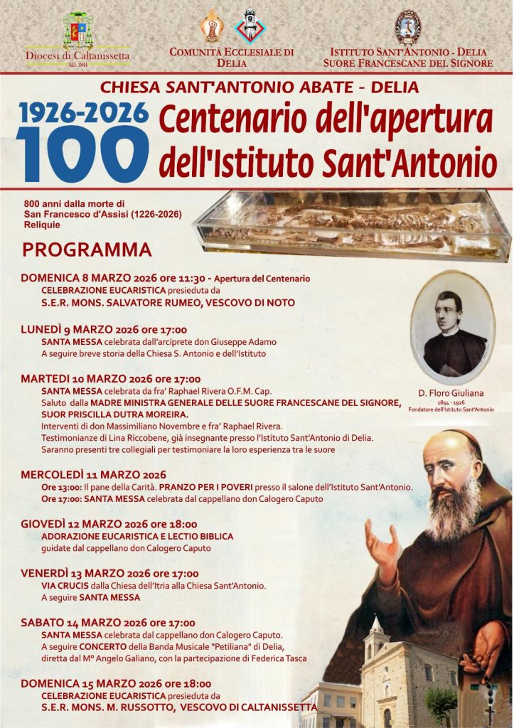 Presiederanno le celebrazioni eucaristiche in programma per il centenario, fra Raphael Rivera OFM, padre Giuseppe Adamo, padre Calogero Caputo, cappellano delle Suore. Interverranno nelle occasioni di ricostruzione della storia della presenza francescana a Delia, la prof. Lina Riccobene e don Massimiliano Novembre.