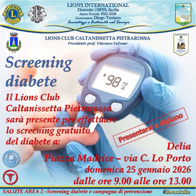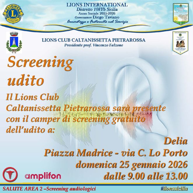 Domenica 25 gennaio 2026, a partire dalle ore 9.00 e sino alle ore 13.00, il Lions Club Caltanissetta Pietrarossa sarà presente nel Comune di Delia per effettuare gli screening gratuiti di udito e diabete.