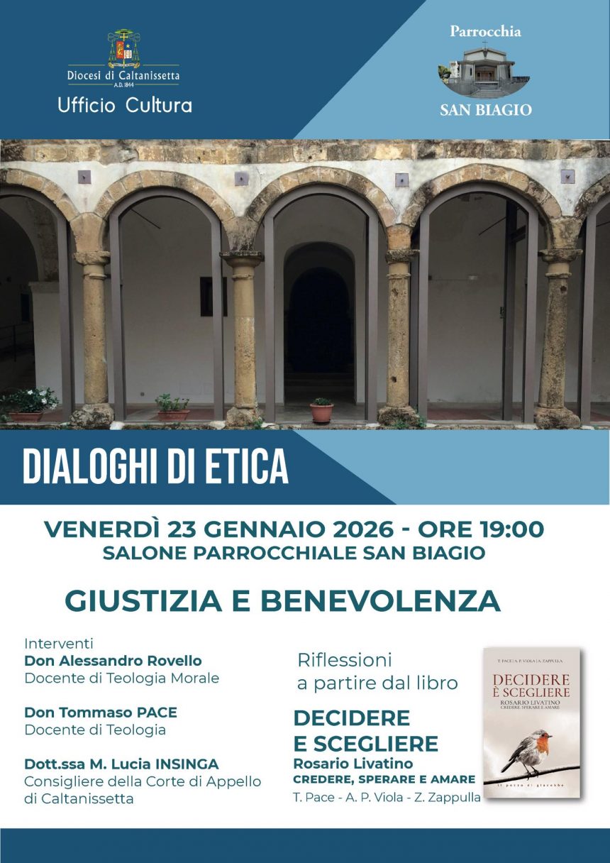 Per il ciclo “Dialoghi di Etica“, promosso dall’Ufficio Cultura della Diocesi di Caltanissetta, diretto da padre Alessandro Rovello, venerdì 23 gennaio alle 19, nel salone parrocchiale di San Biagio (via Leone XIII) si terrà l’incontro “Giustizia e Benevolenza” riflessioni a partire dal libro “Decidere e scegliere – Rosario Livatino, credere sperare e amare” di T. Pace, A.P. Viola e Z. Zappulla.