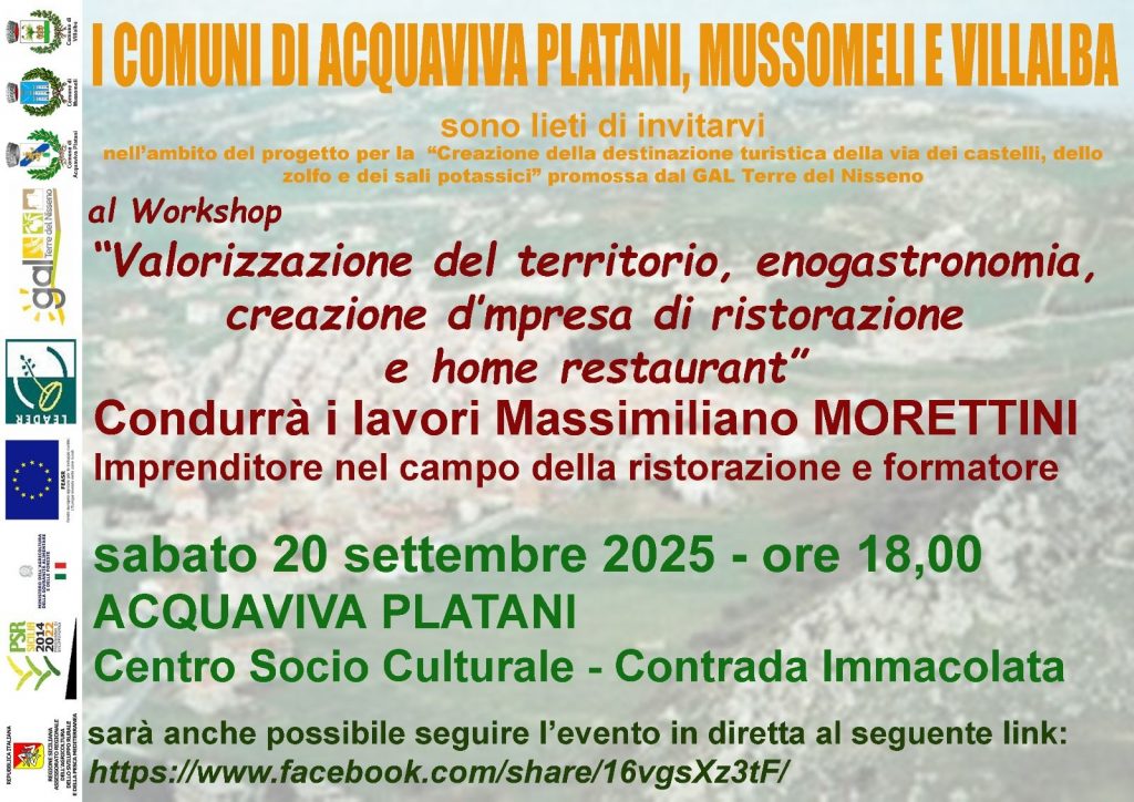 Il secondo workshop sarà dedicato a “Valorizzazione del territorio, enogastronomia, creazione d’impresa di ristorazione e home restaurant“, si svolgerà ad Acquaviva Platani il 20 settembre alle 18, presso il Centro Socio-culturale di Contrada Immacolata, e sarà condotto da Massimiliano Morettini, imprenditore nel campo della ristorazione e formatore.