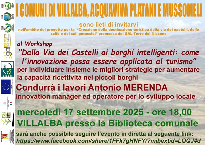 I Comuni di Villalba, Acquaviva Platani e Mussomeli, nell’ambito del progetto per la “Creazione della destinazione turistica della Via dei Castelli, dello Zolfo e dei Sali potassici” promosso dal GAL Terre del Nisseno, organizzano due workshop rivolti agli operatori economici e a chi vuole intraprendere una nuova esperienza di microimprenditoria nel campo dell’accoglienza turistica.