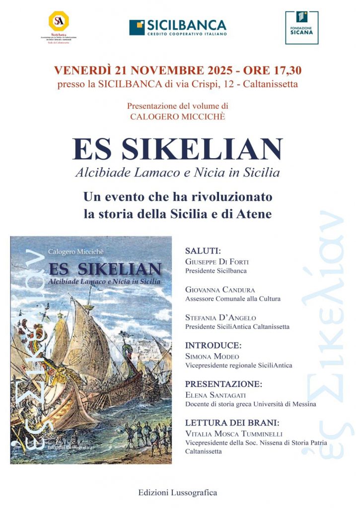 Venerdì 21 novembre, alle 17,30, presso la Sicilbanca (via Crispi 12) a Caltanissetta si presenta l’ultimo studio del prof. Calogero Miccichè, “Es Sikelian, un evento che ha rivoluzionato la storia della Sicilia e di Atene“, edito da Lussografica.
