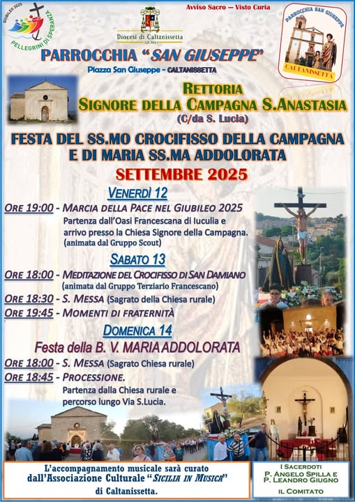 La chiesa di contrada S. Lucia, dedicata al Signore della Campagna, sarà il fulcro di una tre giorni di riflessione e devozione, promossa dalla parrocchia S. Giuseppe a cui la chiesa appartiene, guidata da padre Angelo Spilla, dal 12 al 14 settembre, in occasione della festa del SS. Crocifisso e di Maria SS. Addolorata.