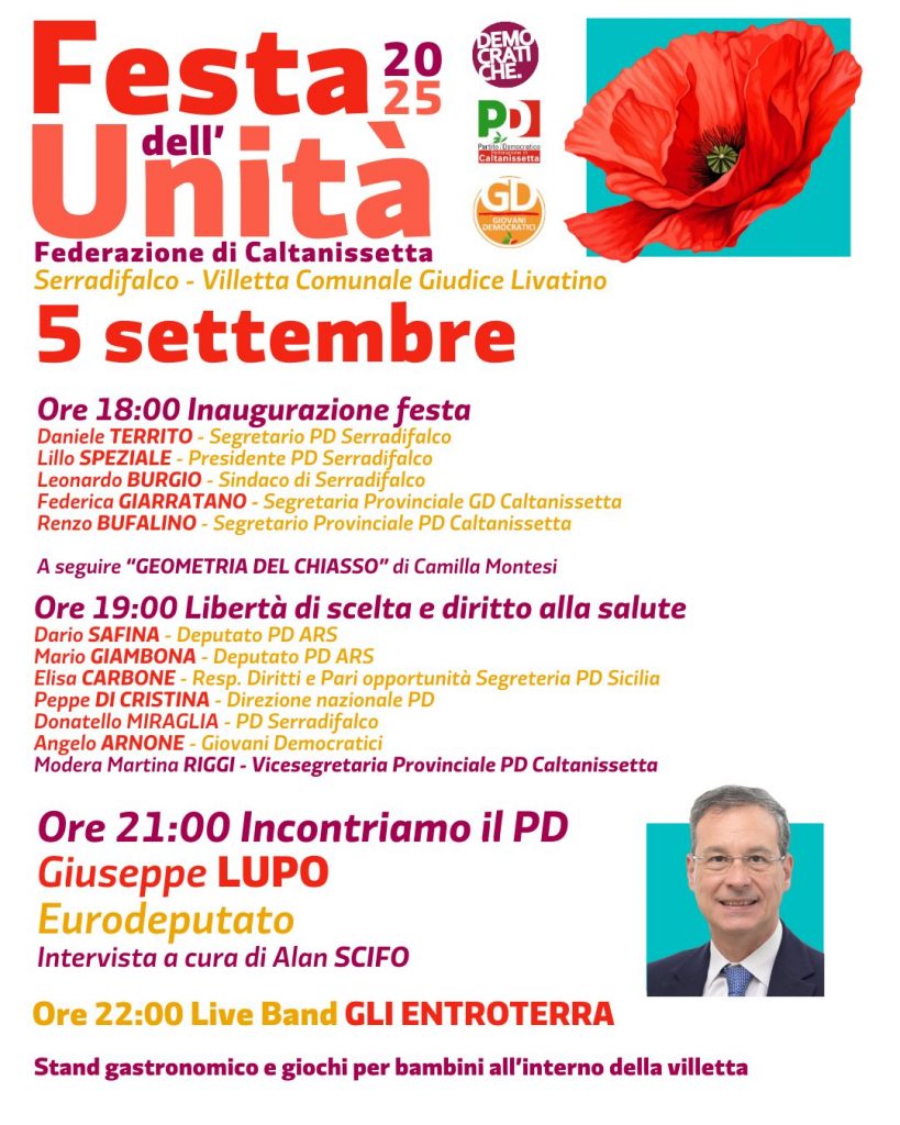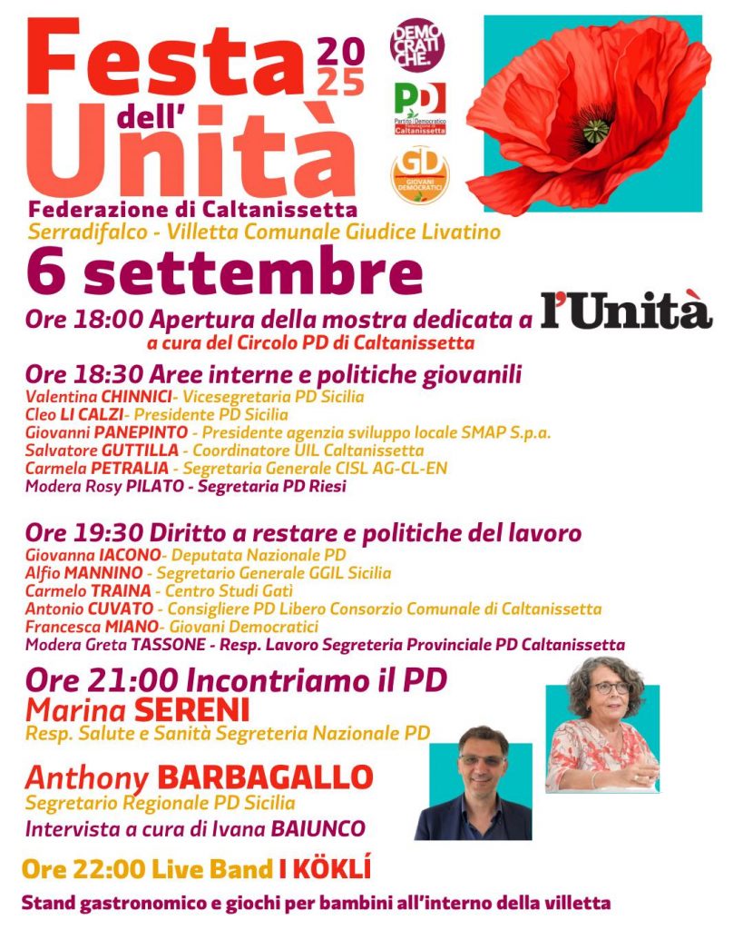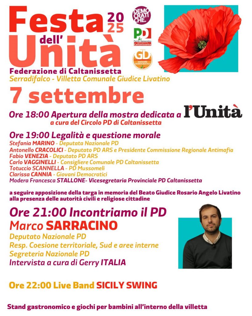 Il Partito Democratico della Federazione Provinciale di Caltanissetta presenta la Festa dell’Unità 2025, che si svolgerà a Serradifalco, presso la Villetta Comunale Giudice Livatino, nei giorni 5, 6 e 7 settembre.