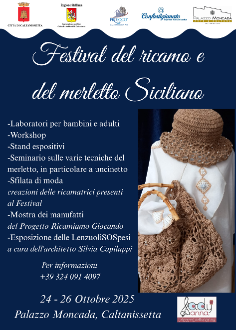 Si svolgerà dal 24 Ottobre al 26 Ottobre 2025 il “Festival del ricamo e del merletto siciliano”, una manifestazione che, nell’elegante location del Palazzo Moncada, riunirà numerose attività, tutte legate insieme da un unico filo conduttore: la preziosa arte del “fatto a mano”.