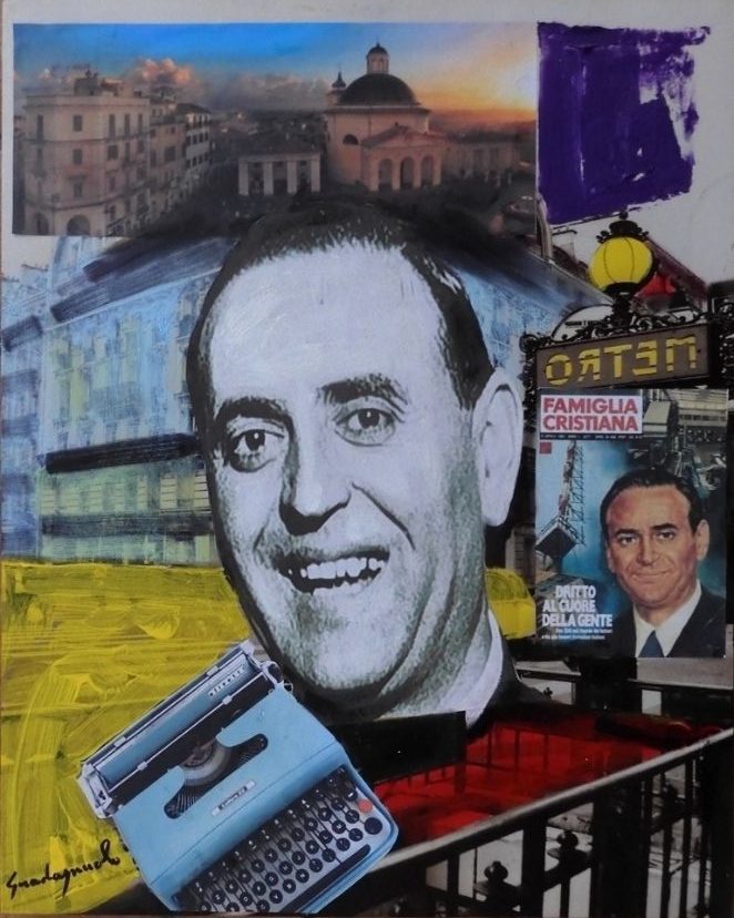Non un semplice ritratto, ma un invito alla riflessione: in ogni segno convivono parola e preghiera, denuncia e consolazione, silenzio e annuncio. La macchina da scrivere portatile è resa in rilievo e la copertina del settimanale Famiglia Cristiana è presentata come simbolo di memoria collettiva. L’assenza di uno sfondo dettagliato accentua il silenzio che avvolge il ritratto e ne aumenta la forza evocativa.