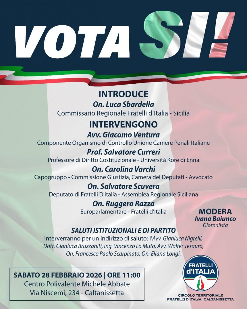 Il Circolo Territoriale di Fratelli d’Italia Caltanissetta organizza per sabato 28 febbraio 2026 alle ore 11:00, presso il Centro Polivalente Michele Abbate (Via Niscemi 234, Caltanissetta), l’incontro pubblico dal titolo “VOTA SÌ!”, un momento di approfondimento e confronto sui temi al centro dell’attuale dibattito politico nazionale e regionale.