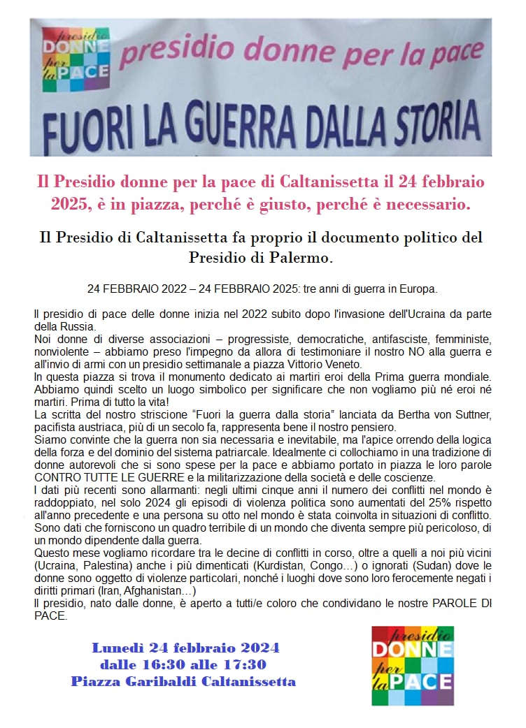 EventiFuori la guerra dalla storia: presidio delle donne per la pace lunedì 24 febbraio in piazza Garibaldi dalle 16,30 alle 17,30 Ultimo aggiornamento: Febbraio 23, 2025 6:21 pm redazione 123 Views Condividere CONDIVIDERE Condividi Questo Articolo Facebook Twitter Whatsapp Whatsapp Copy Link Print