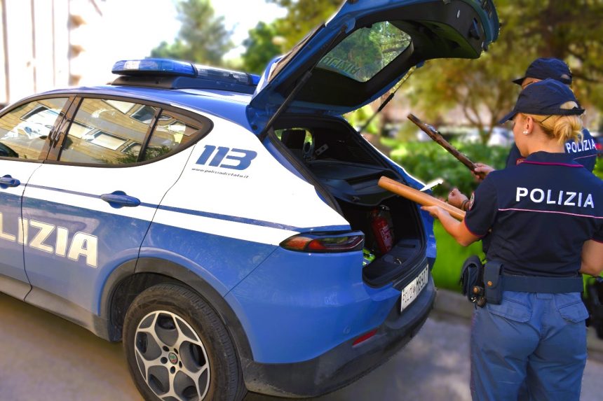 Calci e pugni nella porta di casa della vittima, all’arrivo della Polizia nella macchina dell’uomo sono state trovate e sequestrate due mazze di legno e un coltello.