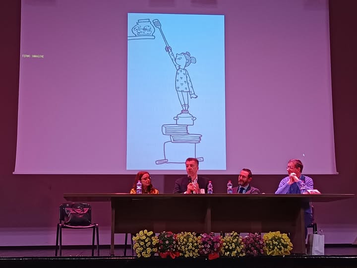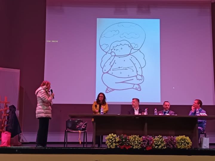 Il disegno di un coccodrillo con le scarpe fuxia proiettato sul maxischermo dell’auditorium del liceo “Volta”: è un disegno di Giulia Cecchettin per Comix, nel giorno in cui suo padre Gino è a Caltanissetta per incontrare gli studenti, su un palco pieno di margherite colorate, fiori piccoli ma resistenti, scelti per essere segno di forza gentile e seme di futuro.
