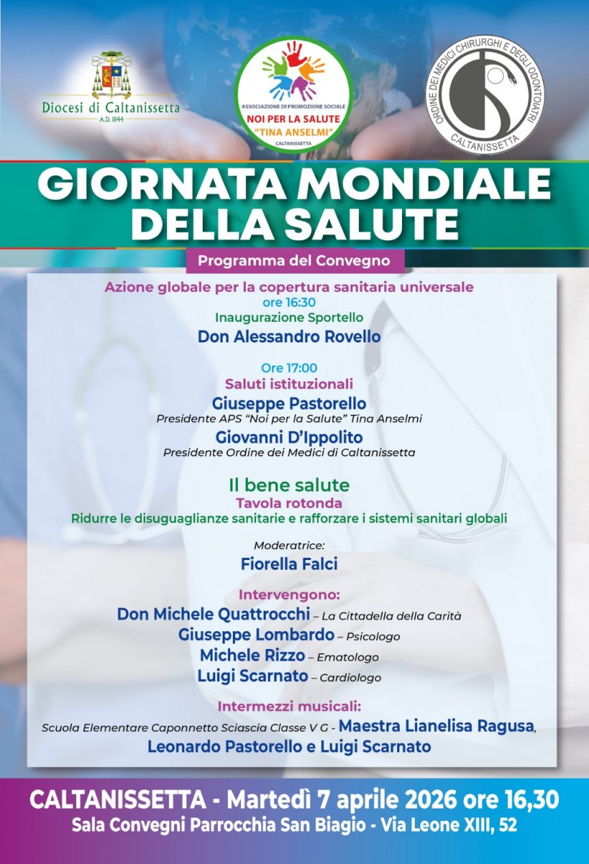 Martedì 7 aprile, Giornata Mondiale della Salute, l’associazione “Noi per la salute – Tina Anselmi“, insieme alla Diocesi di Caltanissetta e all’Ordine provinciale dei Medici, organizza un Convegno presso il salone della Parrocchia San Biagio, a Caltanissetta.