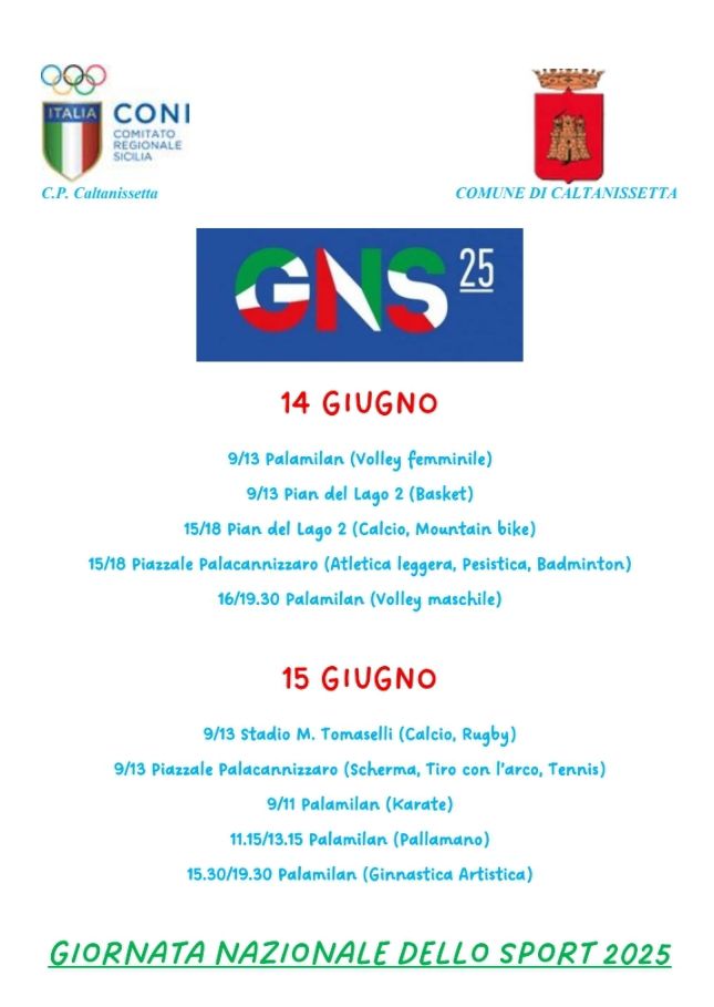 La Giornata Nazionale dello Sport a Caltanissetta…raddoppia! Due intere giornate dedicate allo sport in tutti gli impianti cittadini, sabato 14 e domenica 15 giugno, in collegamento con il Giubileo degli Sportivi, che si svolgerà a Roma con l’ìintervento di Papa Leone XIV.